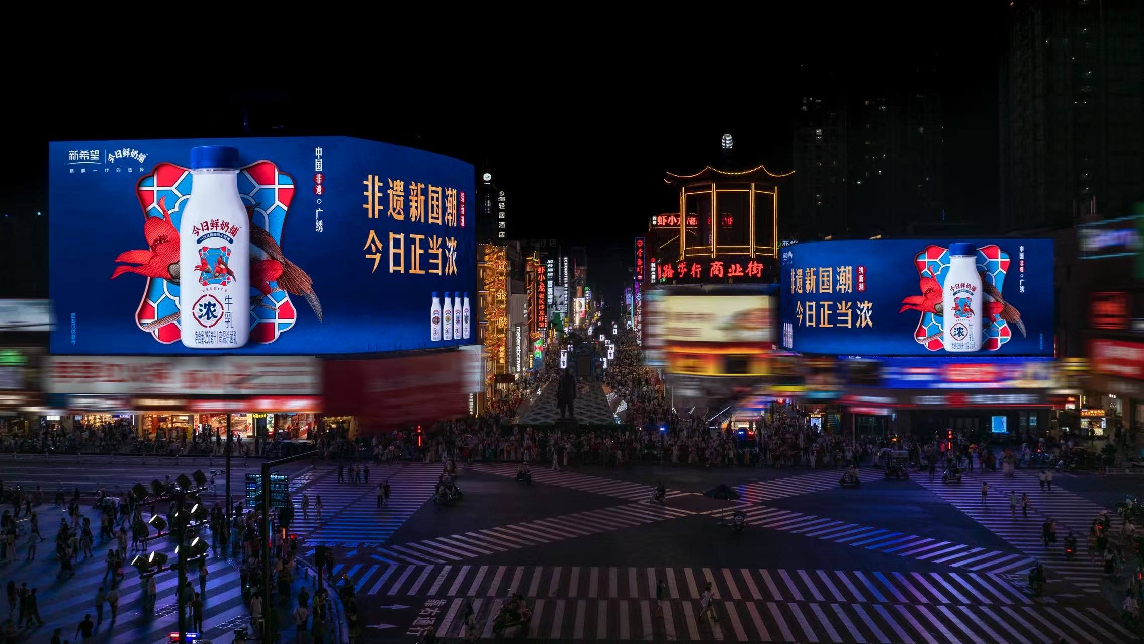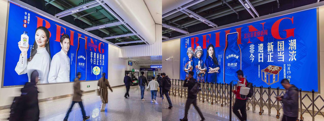 不仅如此,今日鲜奶铺的非遗叙事也从产品延伸至城市公共空间。今日鲜奶铺在文化和自然遗产日这一特殊节点,开启了一场融合节日与营销的“非遗叙事”。长沙国金中心地标双屏上和北京地铁里的今日鲜奶铺以非遗面貌惊艳亮相,饱含非遗韵味的画面通过大范围的户外广告投放吸引了大量关注。在建立广泛关注的基础上,今日鲜奶铺进一步打造深度体验场景,在长沙火宫殿,让民俗与非遗焕发全新魅力;在深圳南头古城,让传统与现代潮流设计相遇;在无锡南长街,营造出独具韵味的文化消费场景……今日鲜奶铺正步步走出传统商业空间,在真实的街巷中与市民日常建立联结,将品牌活动升级为城市级文化事件,在公共领域与消费者进行大规模沟通,将属于今日鲜奶铺的国潮“浓”带到了消费者面前。